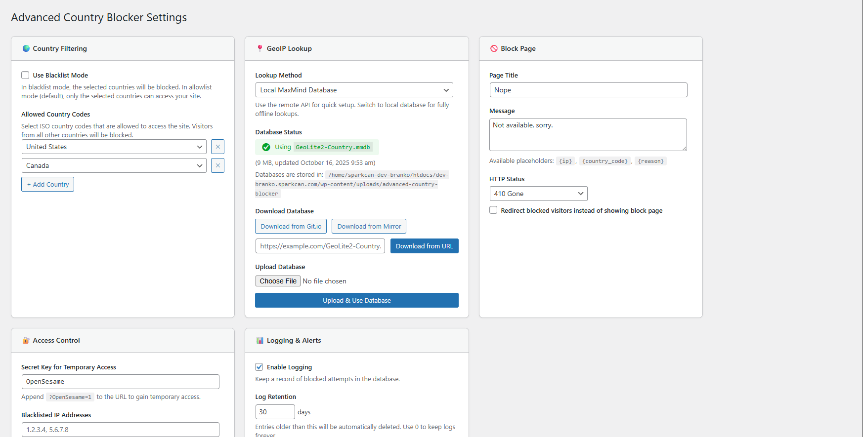 Advanced Country Blocker helps you secure your WordPress site by restricting access based on the visitor’s geolocation (country) or IP address. Upon activation, the plugin detects the activating admin’s country and automatically sets that as the only allowed country. All other visitors from different countries are blocked, unless they use a secret key parameter to temporarily whitelist their IP. Country detection uses the privacy-friendly ip-api.com service by default but can be switched to a fully offline MaxMind GeoLite2 (or compatible) database file once you configure a local copy.