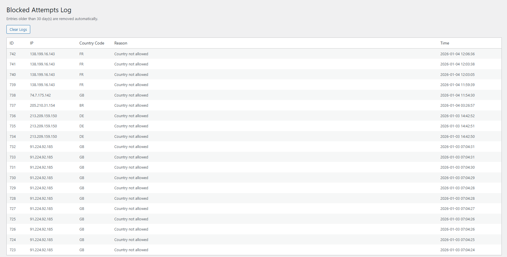 - Detailed logging of blocked attempts in a custom database table, displayed in the WP admin.
