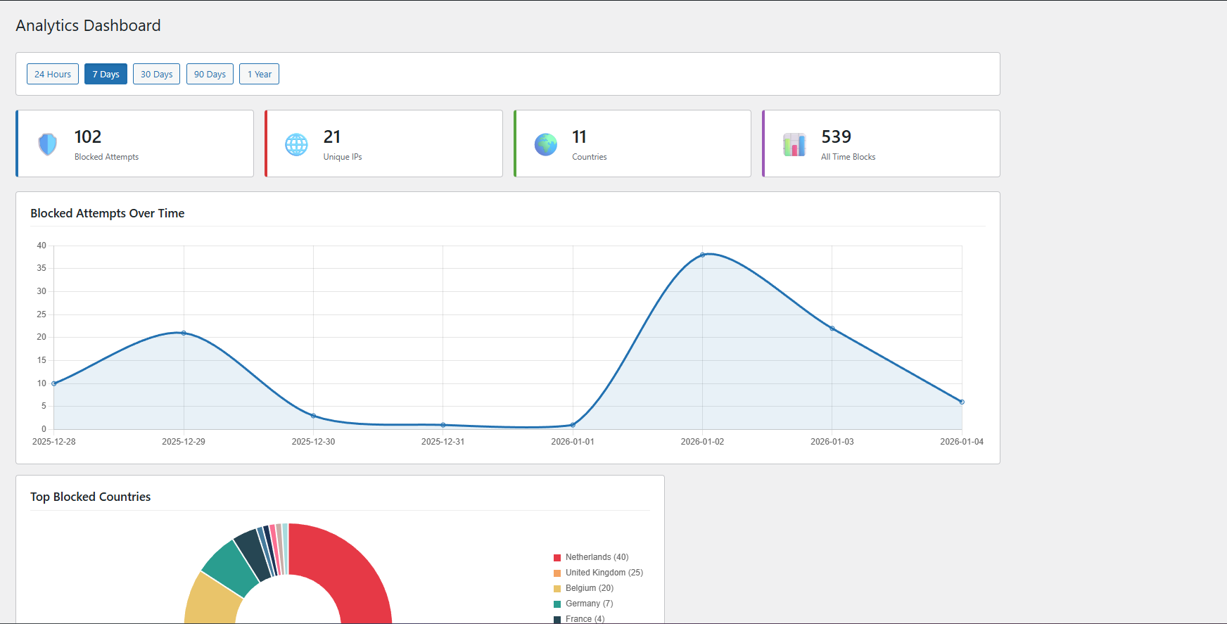 - New: Added Analytics Dashboard with interactive charts showing blocked attempts over time, top countries, and block reasons