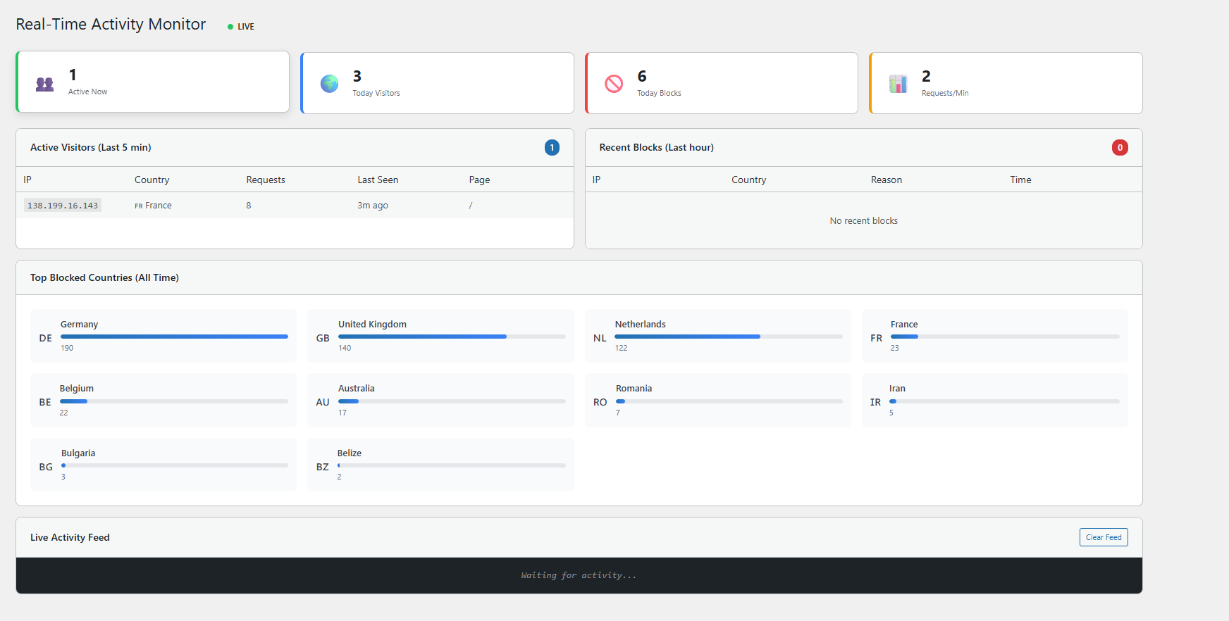- Real-Time Activity Monitor – live dashboard showing active visitors, recent blocks, and traffic statistics.