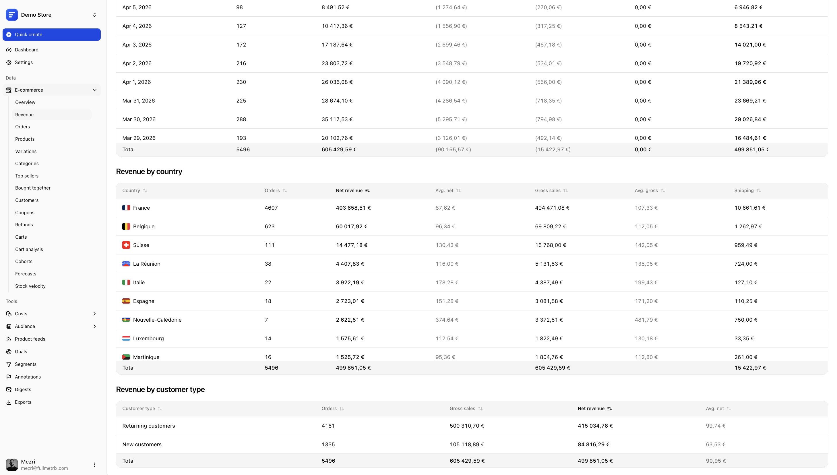 - Revenue intelligence — Net revenue, gross revenue, refunds, average order value, by day, by week, by month, by country, by customer type