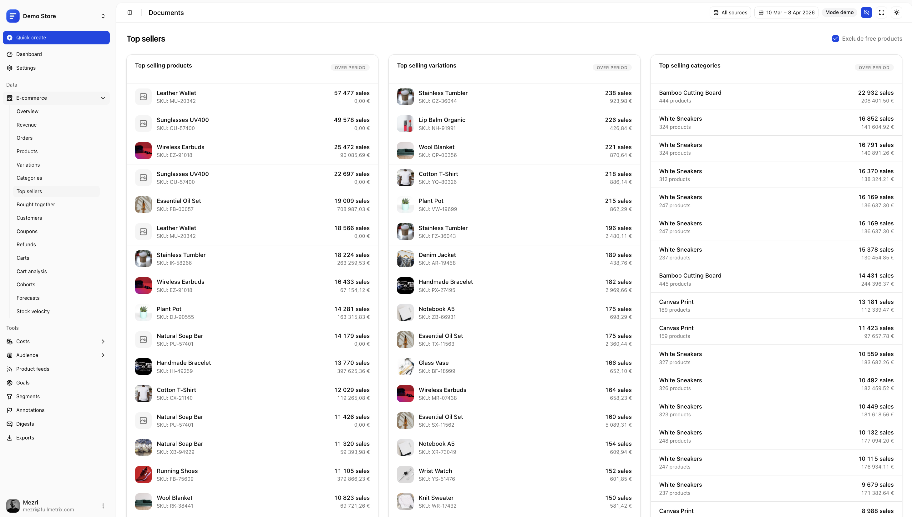- Top sellers — Your bestselling products, variations and categories ranked at a glance
